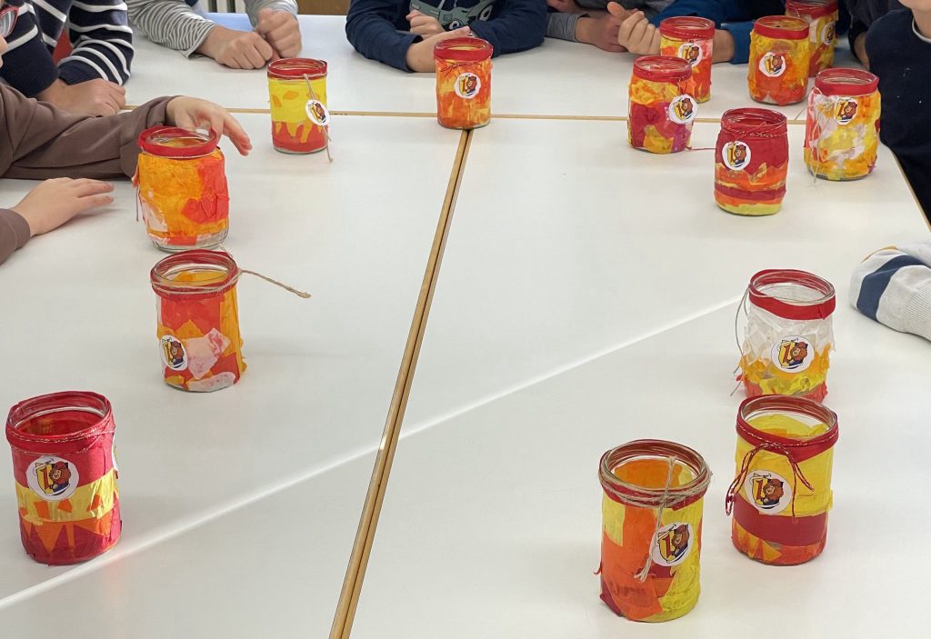 Die Kindergruppe bastelte gemeinsam mit den Betreuerinnen und Betreuern fleißig Windlichter. Nach viel Begeisterung, noch mehr Bastelkleber an allen möglichen Stellen (auch außerhalb der zu beklebenden Gläser) und einer kleinen Putzaktion im Unterrichtsraum waren die bunten Herbstlichter zur Freude der Kinder fertig.