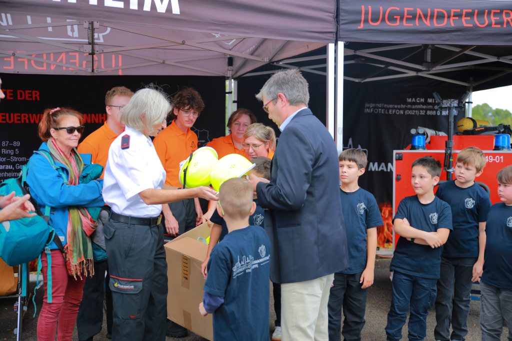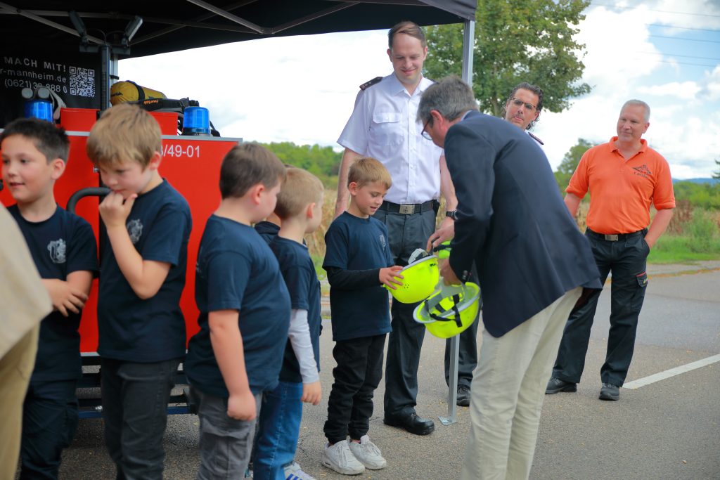 Die offizielle Vorstellung der neu gegründeten Kindergruppe „Löschlöwen“ war das Highlight des Tages. Die Abteilungskommandanten Marco Lorig und Kristof Kopp gaben einen kurzen Einblick in die Abteilung, bevor Anja Süntzenich – die Leiterin der Kindergruppe – diese kurz vorstellt und auch dem Betreuerteam dankte. Die Kids im Alter zwischen 6 und 10 Jahren waren sichtlich aufgeregt, als es zum Gruppenfoto ging und die beiden Vertreter des Lions-Clubs, Präsident Rainer Neumann und Schatzmeister Thomas Steitz, die gespendeten Kinderhelme, Handschuhe und Leinenbeutel übergaben.