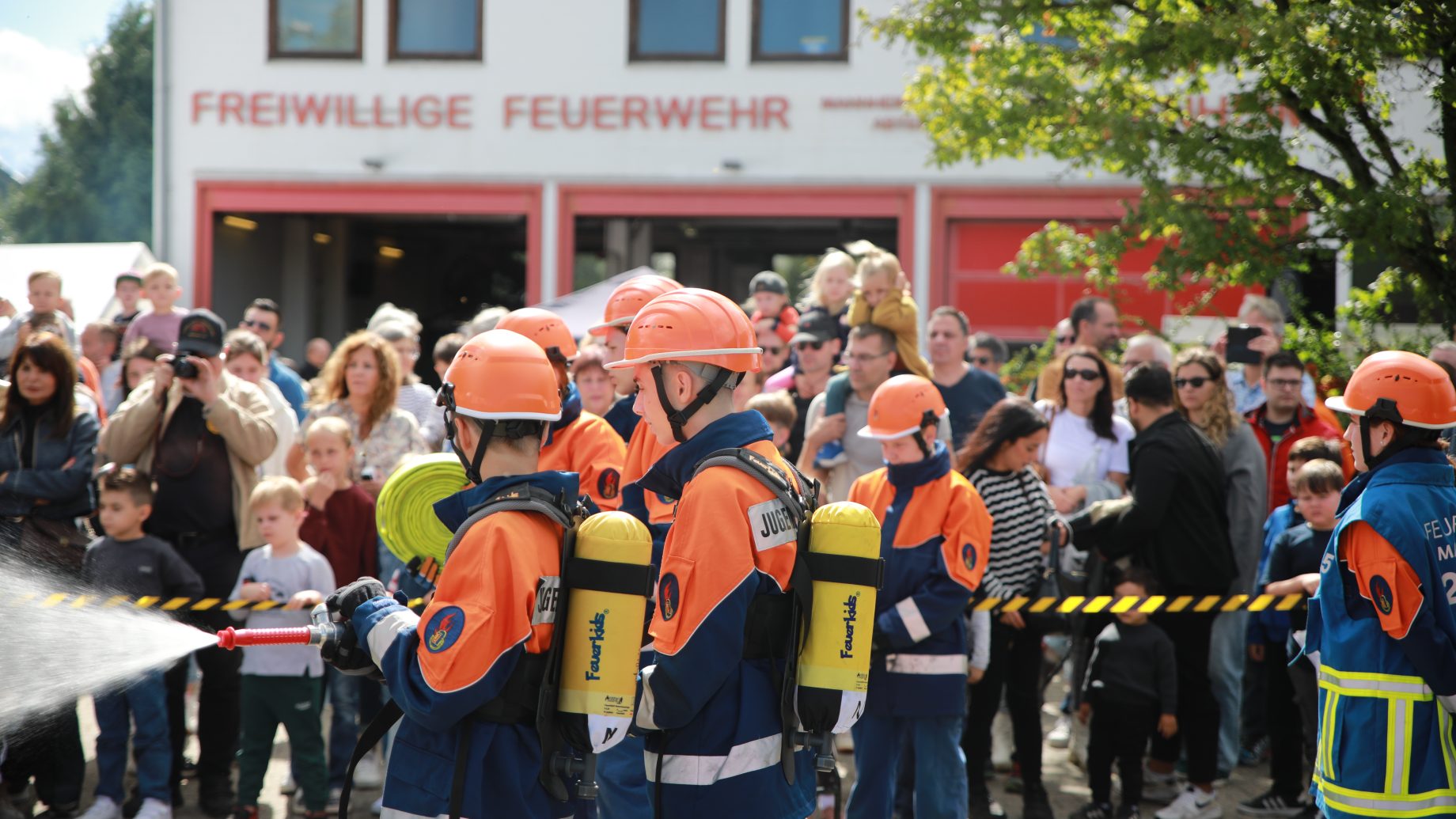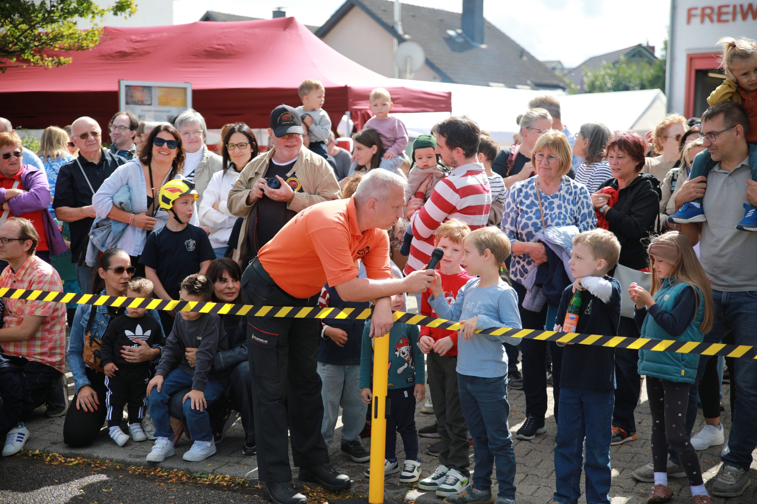 Im Anschluss zeigte die Jugendfeuerwehr ihr Können. In einer Einsatzübung wurde ein brennender Müllcontainer gelöscht, was bei allen Zuschauern für Begeisterung sorgte. Auch die kleinen Zuschauer wurden in Sachen Notruf in die Übung mit einbezogen – schnell wurde klar, dass die meisten Kinder die Notrufnummer 112 sicher beherrschen.