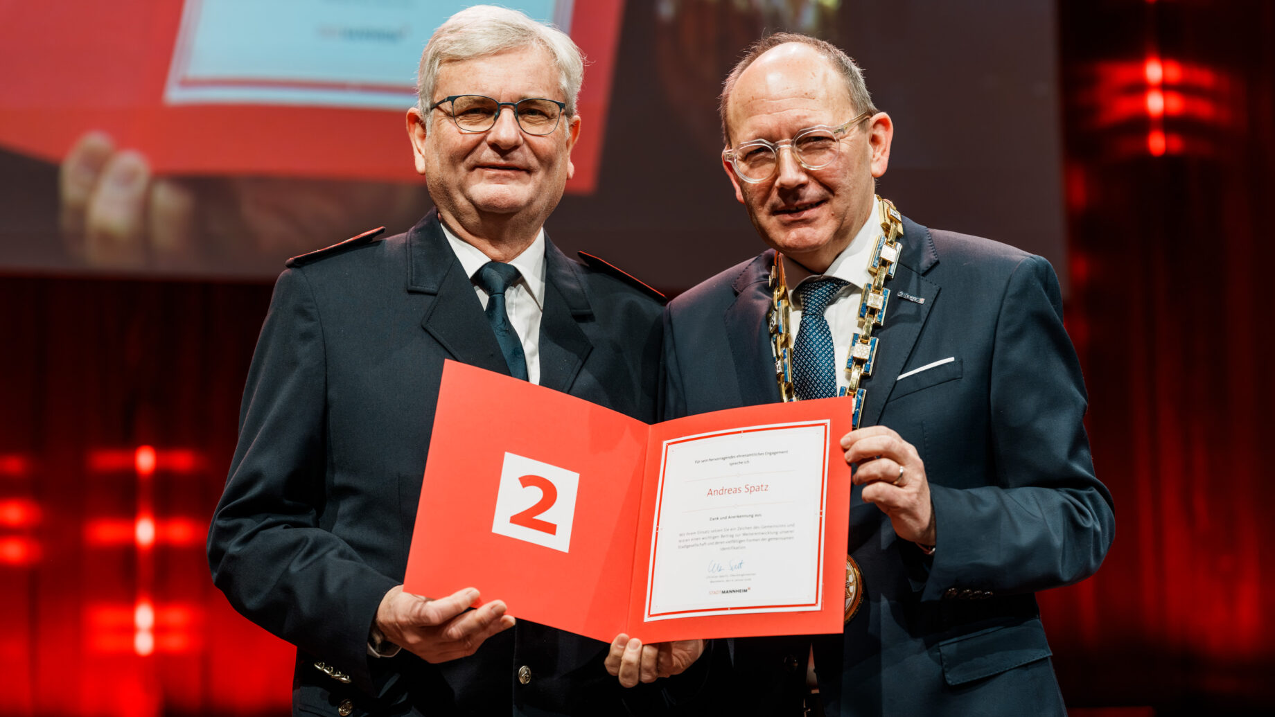Oberbürgermeister Christian Specht überreichte die Urkunde in einem voll besetzten Saal im Rosengarten und sagte „Für sein hervorragendes ehrenamtliches Engagement spreche ich Andreas Spatz Dank und Anerkennung aus. Mit Ihrem Einsatz setzen Sie ein Zeichen des Gemeinsinns und leisten einen wichtigen Beitrag zur Weiterentwicklung unserer Stadtgesellschaft un dderen vielfältigen Formen der gemeinsamen Identifikation.“