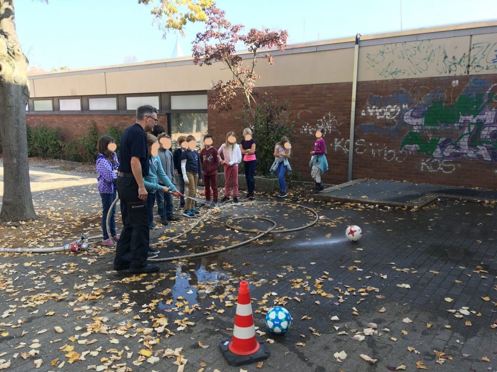 Die Feudenheimer Feuerwehr war zu Gast in der Brüder-Grimm-Schule um mit den Schülerinnen und Schülern der 4. Klassen das Thema „Feuer“ etwas zu untermalen.