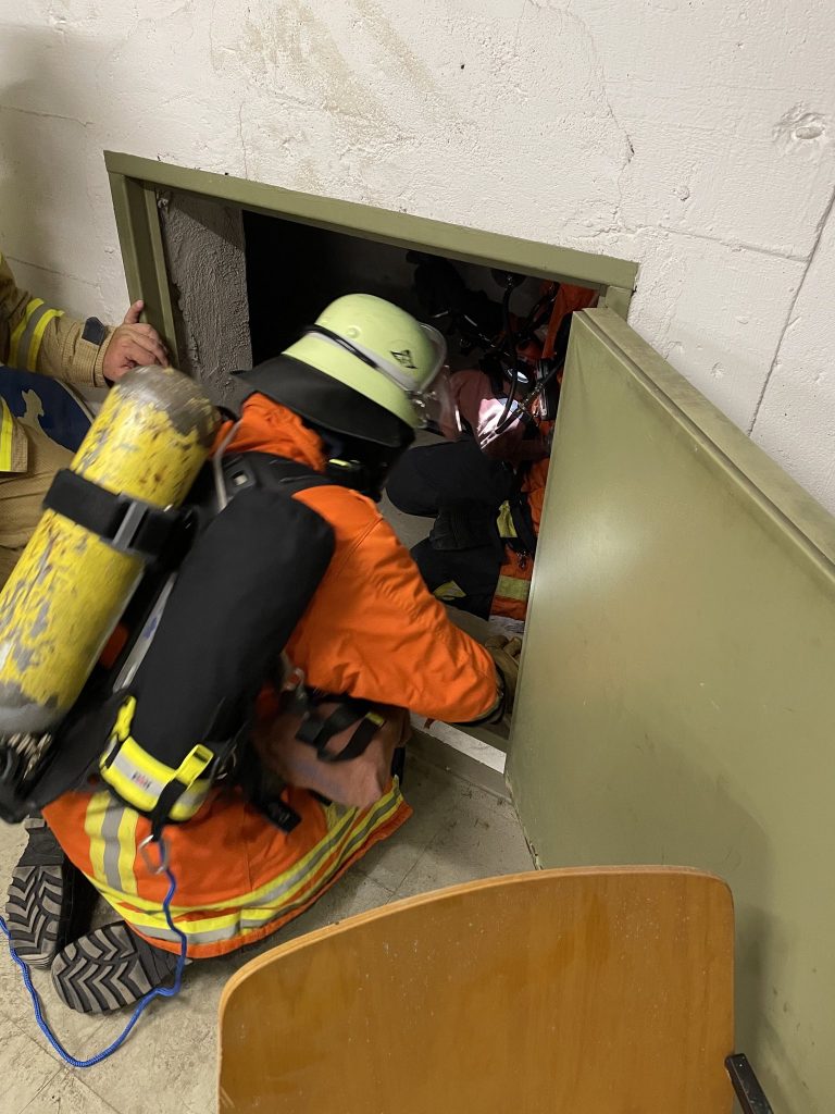 Im Abschnitt Menschenrettung gingen mehrere Trupps unter Atemschutz teils gebückt, teils kriechend, in den Tunnel vor, der an manchen Stellen nur etwa 1,20m breit und hoch war. Dies und die Länge des Tunnels forderte die eingesetzten Kräfte sehr und man merkte, wie wichtig die Fitness im Feuerwehreinsatz ist.